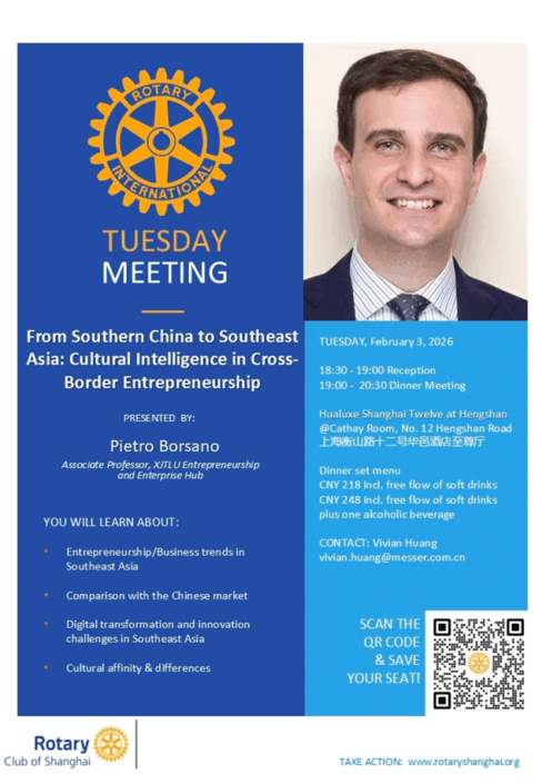 The Rotary Club of Shanghai looks forward to meeting new like-minded people. If you like to join a meeting or event, don’t hesitate to get in touch with our Club Admin Vivian Huang: vivian.huang@messer.com.cn