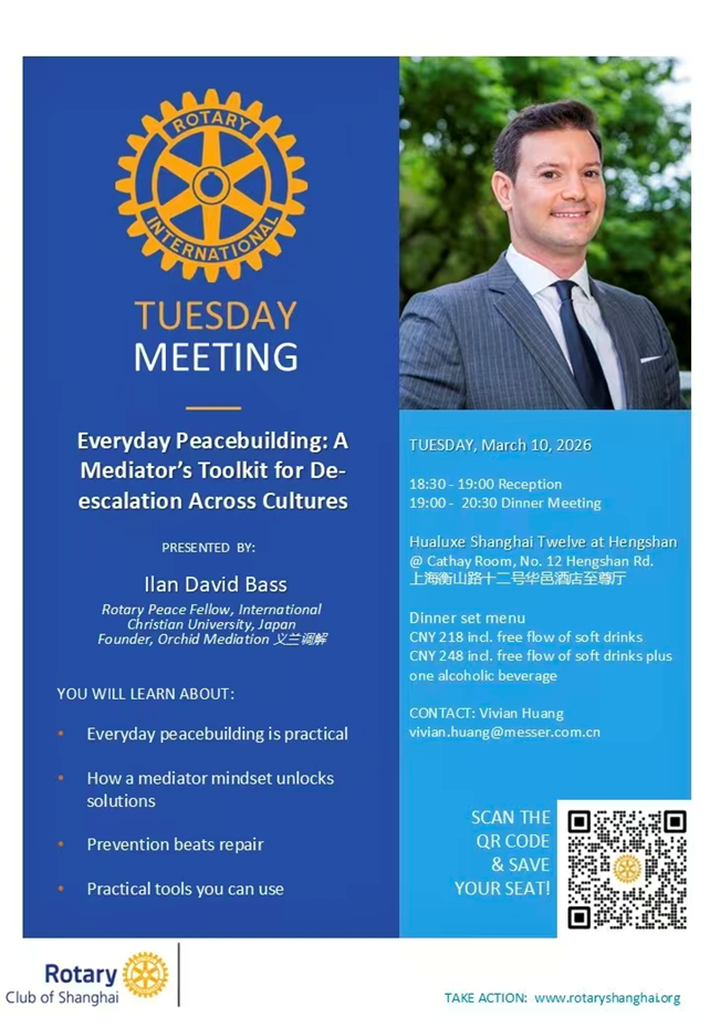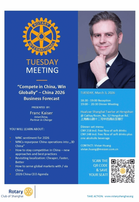 The Rotary Club of Shanghai looks forward to meeting new like-minded people. If you like to join a meeting or event, don’t hesitate to get in touch with our Club Admin Vivian Huang: vivian.huang@messer.com.cn